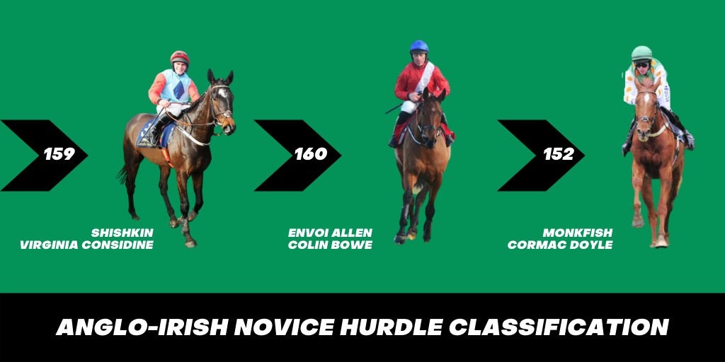 “Top of the pile on 160 is the unbeaten Envoi Allen, an impressive winner of the Ballymore at Cheltenham, and he’s closely followed by Shishkin (159) and Abacadabras (158), who put some eleven lengths between themselves and the opposition in the Supreme.”